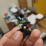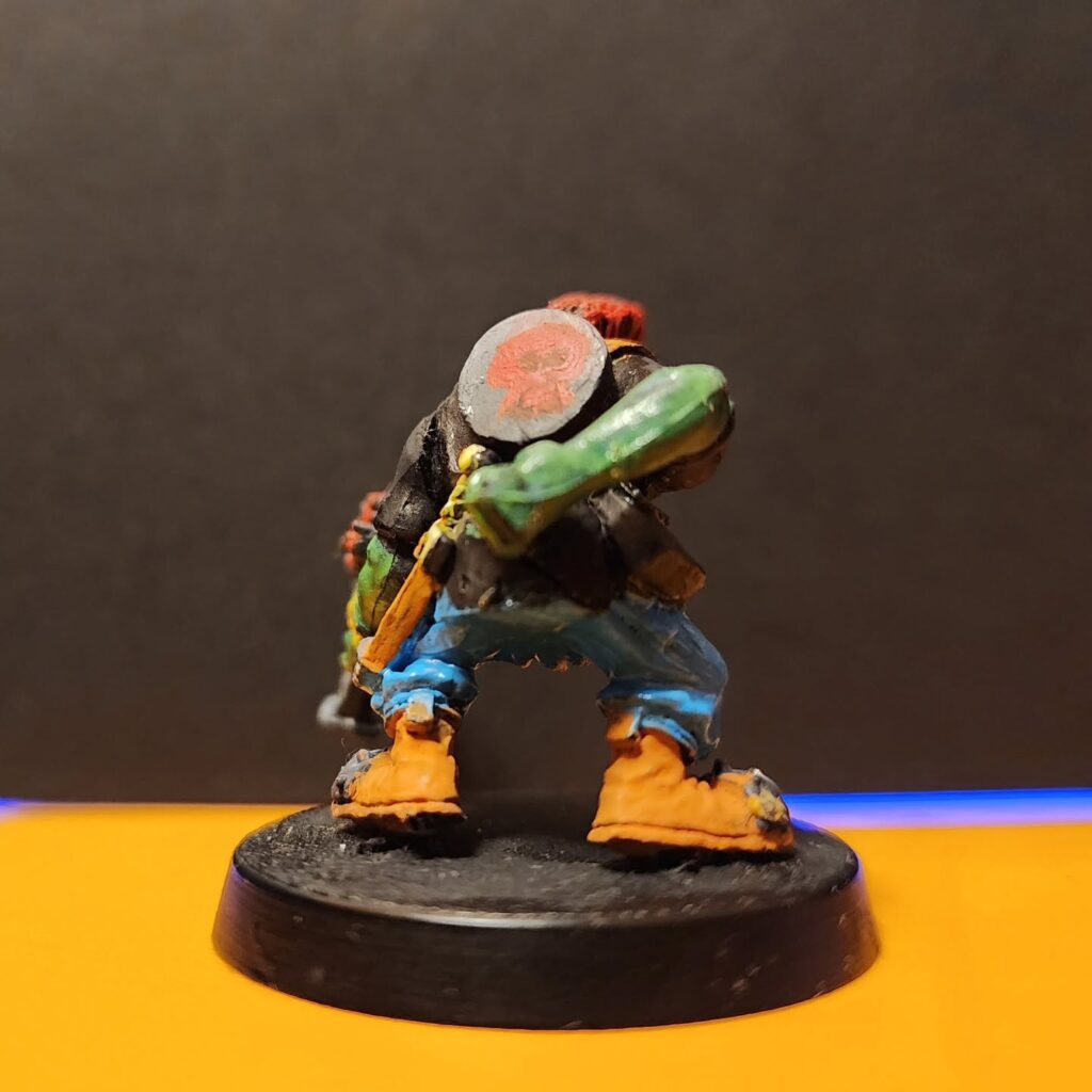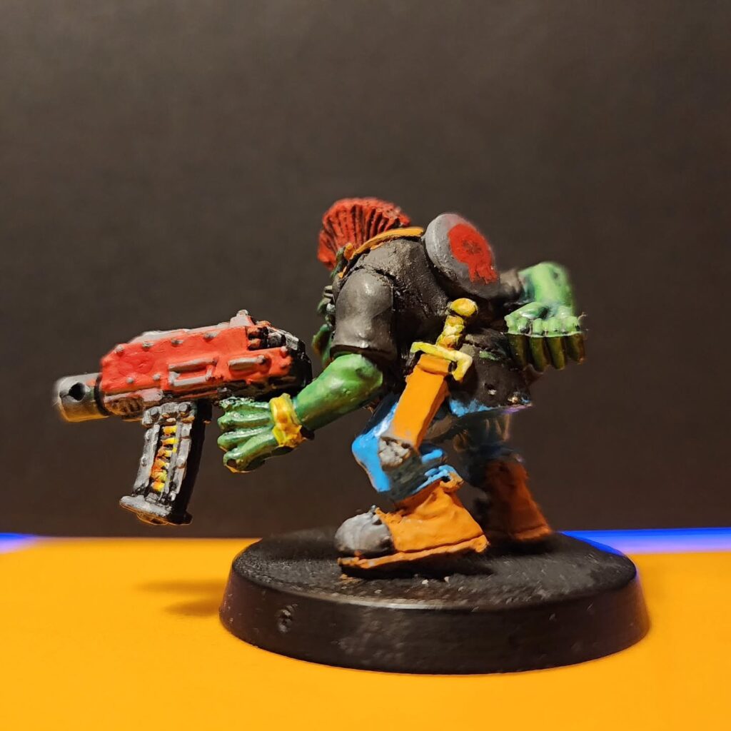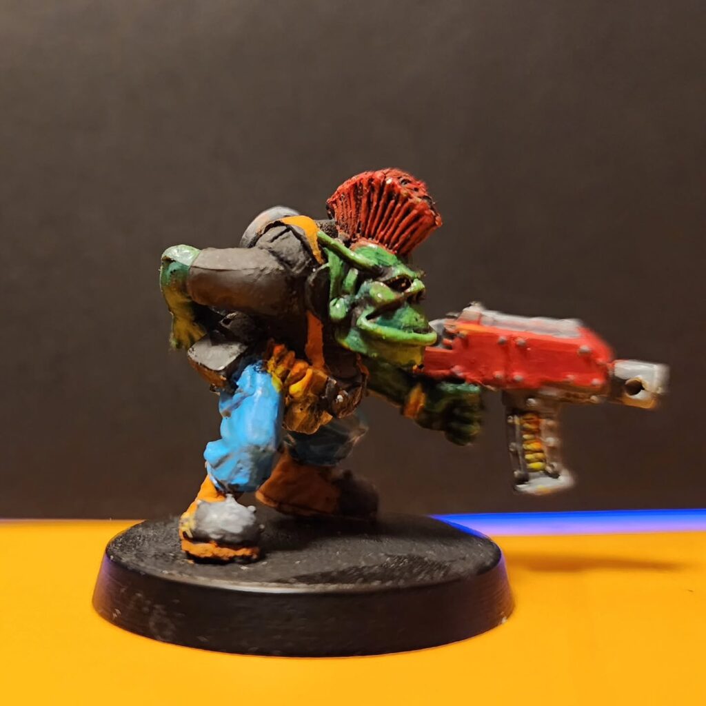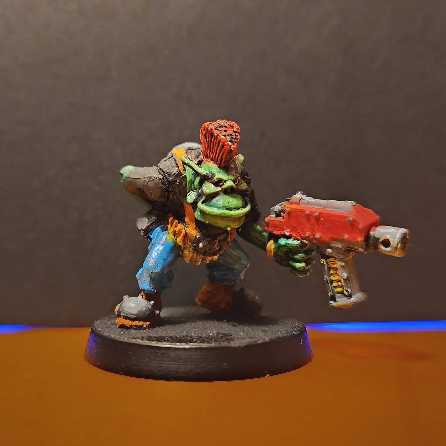 I painted this guy up shortly after my 4th move, bringing me back to my small hometown. I think he turned out great, bright poppy colors and I decided that he would be a Goff like my goff rocker because of his bangin mowhawk. This is the second miniature from the Ork Badmoon blister I bought off a guy in Winnipeg. And just like all my other vintage models is still waiting for a sutible goblin green base.